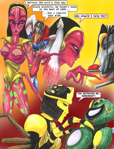 - "Betray" Confession Part One - A storyboard I was working on dealing with the rather nonexistant relationship between Starscream and Black Arachnia. The thing I like most is the mini-flashback. prismacolour with Freehand and Photoshop enhancements. (76k, 7-7-00)