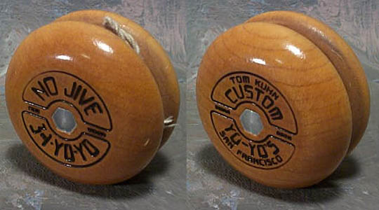 * - "Hawaii" - wood yo with a Hawaiian ceremonial helmet design of some kind. Doesn't really play, since the sctring is embedded in the axle, and will not allow the yo to sleep. Pretty design, though.