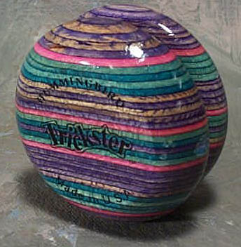 *** - Acacia koa - Another yo from Hawaii (family members travel a lot), this one made of the Koa species of Acacia. Other than something turtle-like, I've no idea what the design is, or means. It plays ok, but it would seem the grain of the axle causes it to sleep on one throw, and return immediately on the next. Reasonably well balanced for hand-made, but one side has a wiggle. Pretty cool looking, though.