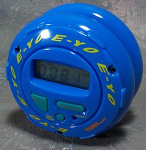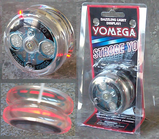 *** - Strobe-Yo - Yomega transaxle design, but with LEDs in the rims, one on each side. The LEDs turn on when you touch a contact on either side of the yo, and ramain on as long as you play. They can be turned off by pressing an internal button with a special pin, or allowed to turn off automatically after a few minutes at rest. It plays ok, but it's pretty heavy, and the light aren't as impressive as the one below. With a hefty price tag around $40, it's a hard sell to anyone but a collector.