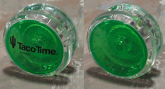 *** - Taco-Time - Promotional yo-yo, came in kids meals. Not a bad yo-yo, actually. Similar in shape to yomega's yoyo's, and plays well enough for a cheapie.