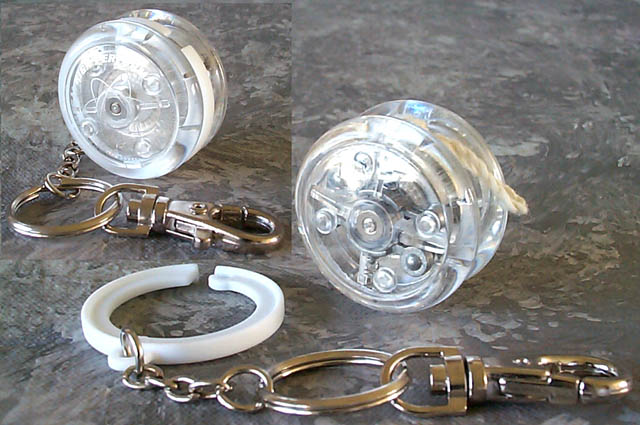 ** - Yo-yo on a keychain - Gimmicky at best. The main problem is that it's so small, it's hard to get a balanced spin on it, and the auto return doesn't help. The auto-return is metal instead of pastic, and one sided, creating an inherent imbalance. Refer to the piture to see how it connects to the keychain.