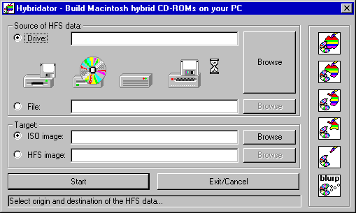 The HFS data can come from a file (image of a HFS volume you made before with Hybridator, or CD-ROM image produced by Toast on the Macintosh), from a Macintosh HD floppy disk, from a magnetical or magneto-optical disk or from a CD-ROM.