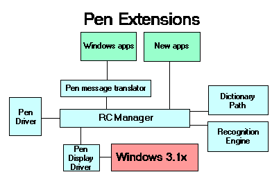 With Pen Extensions handwriting (printing) can be captured and then translated to appear as typed text. This capability allows for new devices to be created that free the user of a keyboard. Pen computers are ideal for situation for those jobs that force one to roam the office or plant. Pen Extensions is a series of modular extensions to MS Windows 3.1 operating environment. The Pen Extensions include a set of DLLs and drivers that enable pen-based input and handwriting recognition in Microsoft Windows. The components of the Pen Extensions are transparent to normal Windows 3.1 applications, and yet they are readily available for those applications that seek to leverage their capabilities. Pen services are available through a new set of APIs, referred to in the following pages as the Pen API. This API is available to every computer running version 3.1 of MS Windows-regards of whether or not that computer is a pen computer or has an attached pen peripheral. Applications developers can therefore leverage the Pen API window classes as well as use other pen API services, and fell confident that their programs will run identically on all machines running MS Windows 3.1. If the pen is present, the Pen API informs applications so they can activate advanced pen-specific features. It also automatically enables pen interaction in the pen control classes. If the pen is not present, the same .EXE will operate without modification under Windows 3.1.