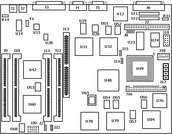 U76 This can be either the N82077AA (used on the 90 and 95) or it can be the National Semiconductor PC8477AV-2 floppy controller. A few systems have the 82077SL controller, PLUS U65 System EPROM 39G3299 is soldered directly to the planar (no PLCC socket needed)