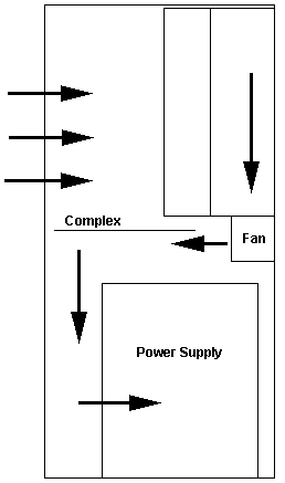Air is sucked over the top of the PSU, past the complex, over the memory, then into the PSU where it is blown out through the exhaust. Though looking at a PSU shows the memory has a blank surface in front of it, probably to force airflow past it.