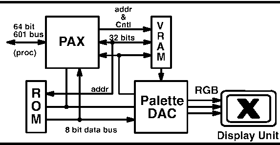 PowerPC 601 bus improves performance by avoiding the latency and synchronization overhead created when converting from one bus to another. The 601 bus is a split address and data bus with 32 bits of address and 64 bits of data [1]. The processor uses byte, half–word, or word operations to access the graphics subsystem. Based on the address of the operation, PAX directs the access to one of four locations: the internal registers, the frame buffer (i.e. the VRAM),
