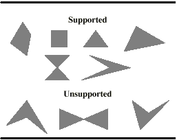 The triangle and quadrilateral fill logic uses the line logic and another simpler line generator to find the edges of the area. Since only two line generators (edge walkers) are available, PAX can only support quadrilaterals which are convex in the Y direction. See Figure 3 for examples of the