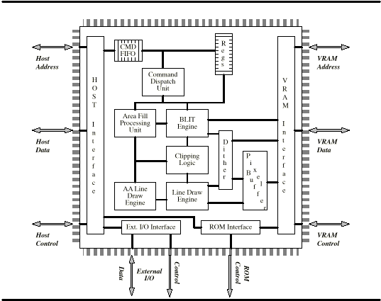 See Figure 2 for a block diagram of the internal architecture. These processing units provide the X Window server (X server) with dedicated hardware to accelerate the rendering of lines, points, and area fills. In addition to rendering, PAX also provides assistance for moving pixels to and from system memory or to and from another screen location. This function is referred to as Bit Block Transfer (Blits).