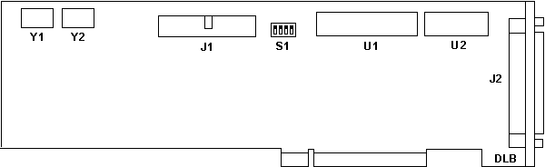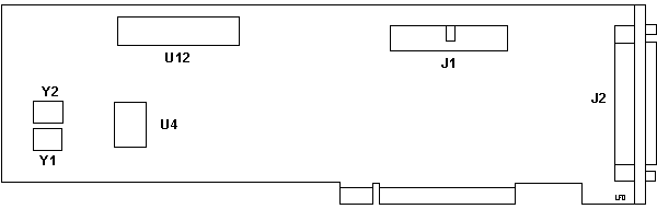 All switch positions are up ("on") on mine; don't know what they do. Y1 & Y2 are reversed from the later board: Y1 = 32MHz, Y2 = 19.2MHz here. They are also the "full-can" crystals. U1 is a NEC 72065C (the diskette controller chip). U2 is a "SED9420", not sure of the function, maybe a data separator. J1 & J2 are the same as the later board. Outside the identified components there is SMC TTL chips that fill every available position otherwise.