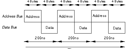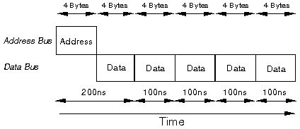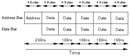 Basic Matched Memory Matched Memory w/o Wait Streaming Data Transfers 32 or 16 bit Streaming 64-bit Streaming 64-bit Streaming w/50ns Cycle Basic Data Transfer Cycle The basic transfer cycle works by first defining the address (in memory or I/O space) where a transfer is to occur, and then, in a second operation of equal length actually transferring the data. Each half of the operation (defining the address and data transfer) takes 100ns, or 200ns total. This process is repeated until the entire block of data has been transferred. Micro Channel - Basic Data Transfer (20MBps) shows basic data transfer in operation. Basic data transfer on the Micro Channel runs at 20MBps (each cycle takes 200 nanoseconds, and 32 bits or 4 bytes of data are transferred at a time). Five such “default” cycles can be performed in a millionth of a second. Each cycle moves four or two bytes per transfer, yielding a data transfer rate of 20MB/sec for 32-bit (4 byte) transfers or 10MB/s for 16-bit (2 byte) transfers. Basic Data Transfer 20MB/sec for