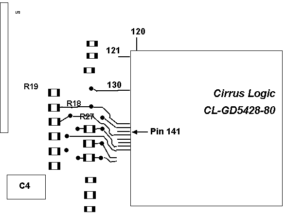 As far as I have traced the connections on the short Cirrus as well as on the Reply Mod. 80 board you could solder another pair of 424260 (or 4C1627 from Micron) 1:1 over the existing chips - minus the pins 14 on the new ones. These are the RAS pins, which have to be connected via a 22 Ohms resistor to pin 141 on the CL5428 chip. It is marked OE* in the datasheet - but a footnote says it is RAS1 on 5426/28/29 chips for the 2MB RAM configurations.