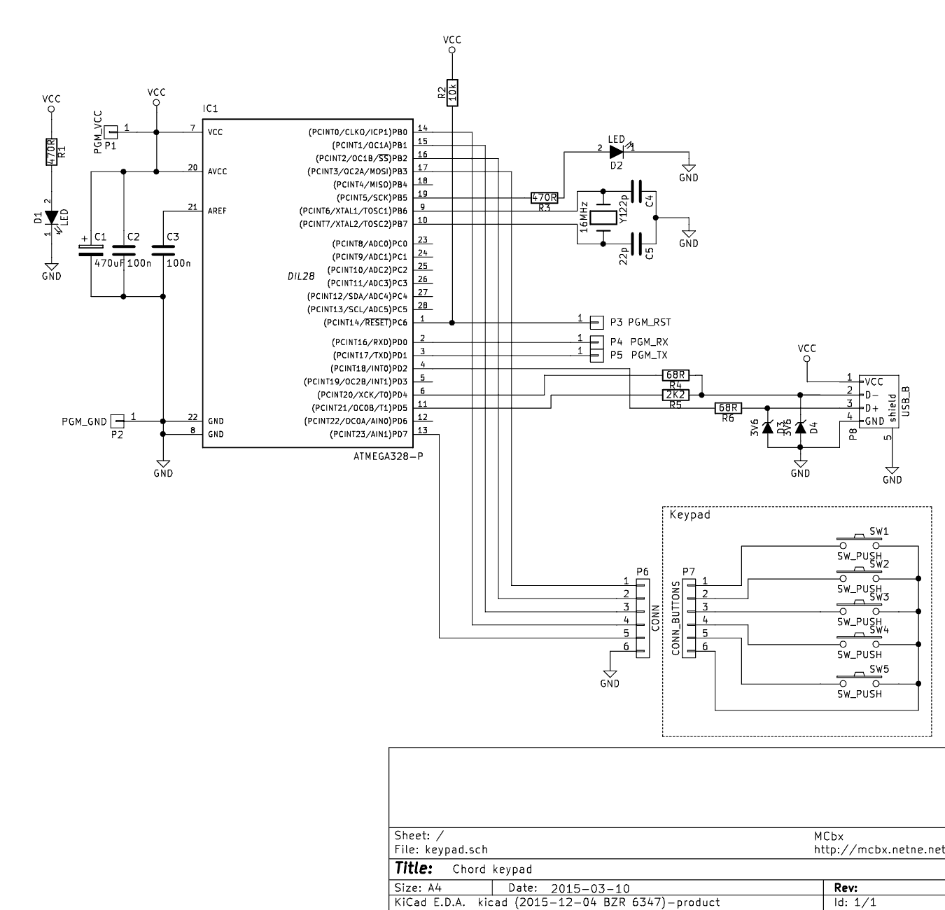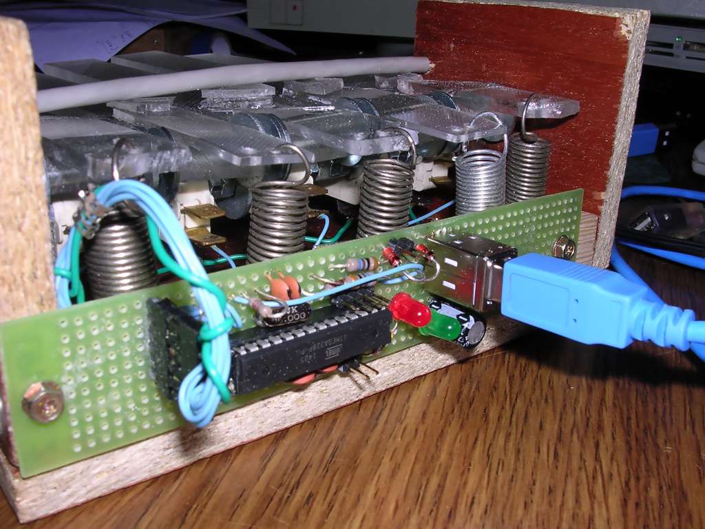 The electronic part has been made on an universal board with Atmega328P microcontroller programmed in Arduino Uno configuration. This way the board can be connected using 5 wires to Arduino Uno board with chip removed and then programmed with a new firmware. USB interface is made using one of V-USB implementations.