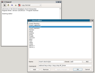 The software has been made in Qt, and is accessible, as all parts of this project, on GPL. It allows to activate/deactivate keys or enter "training mode" in which no commands are executed but their names are shown in a log window. Chord definitions can be modified to start proper program.