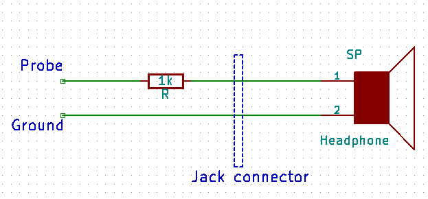 Now video output can be identified. To check for composite video signal, it's convenient to make a probe from an old headphone and resistor. Connect + of headphone to 1kOhm resistor and ground to computer's ground, like you see in the picture below:
