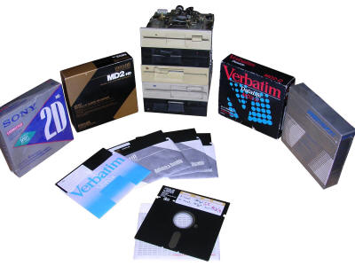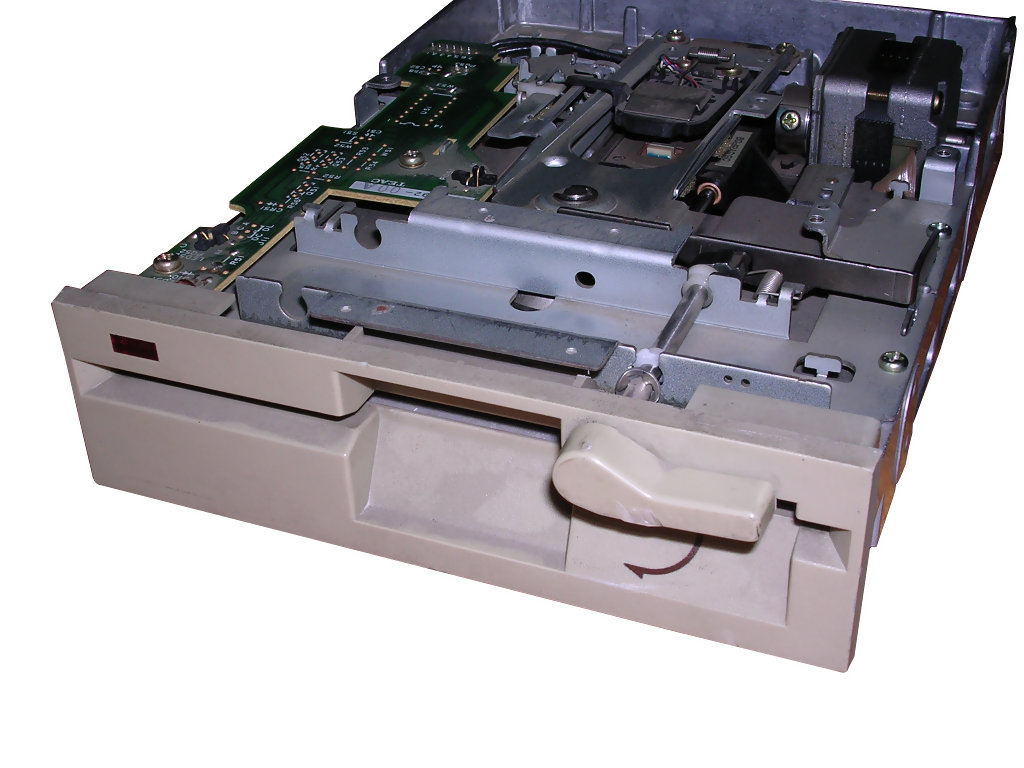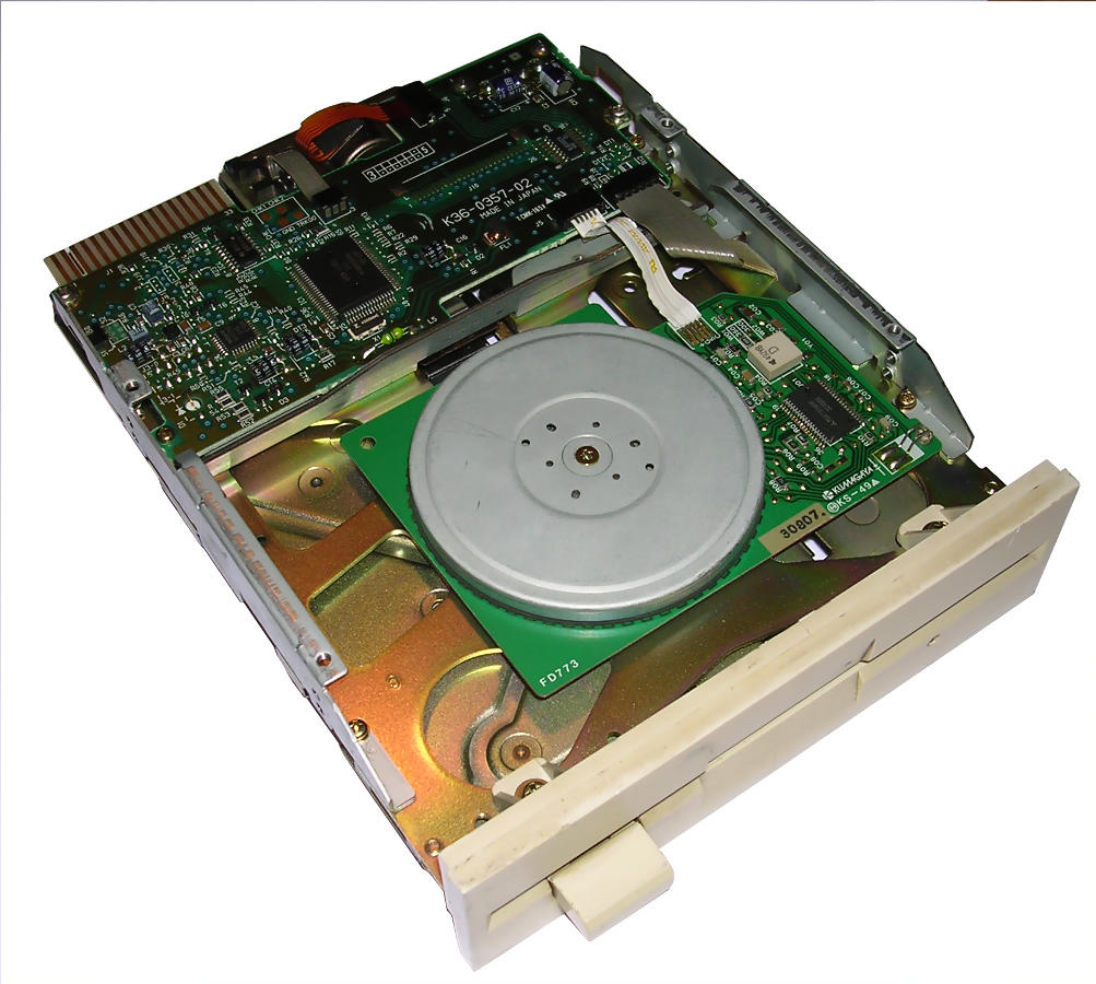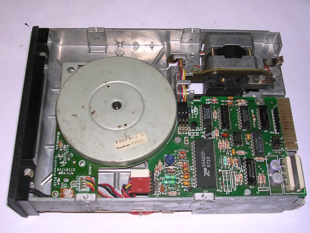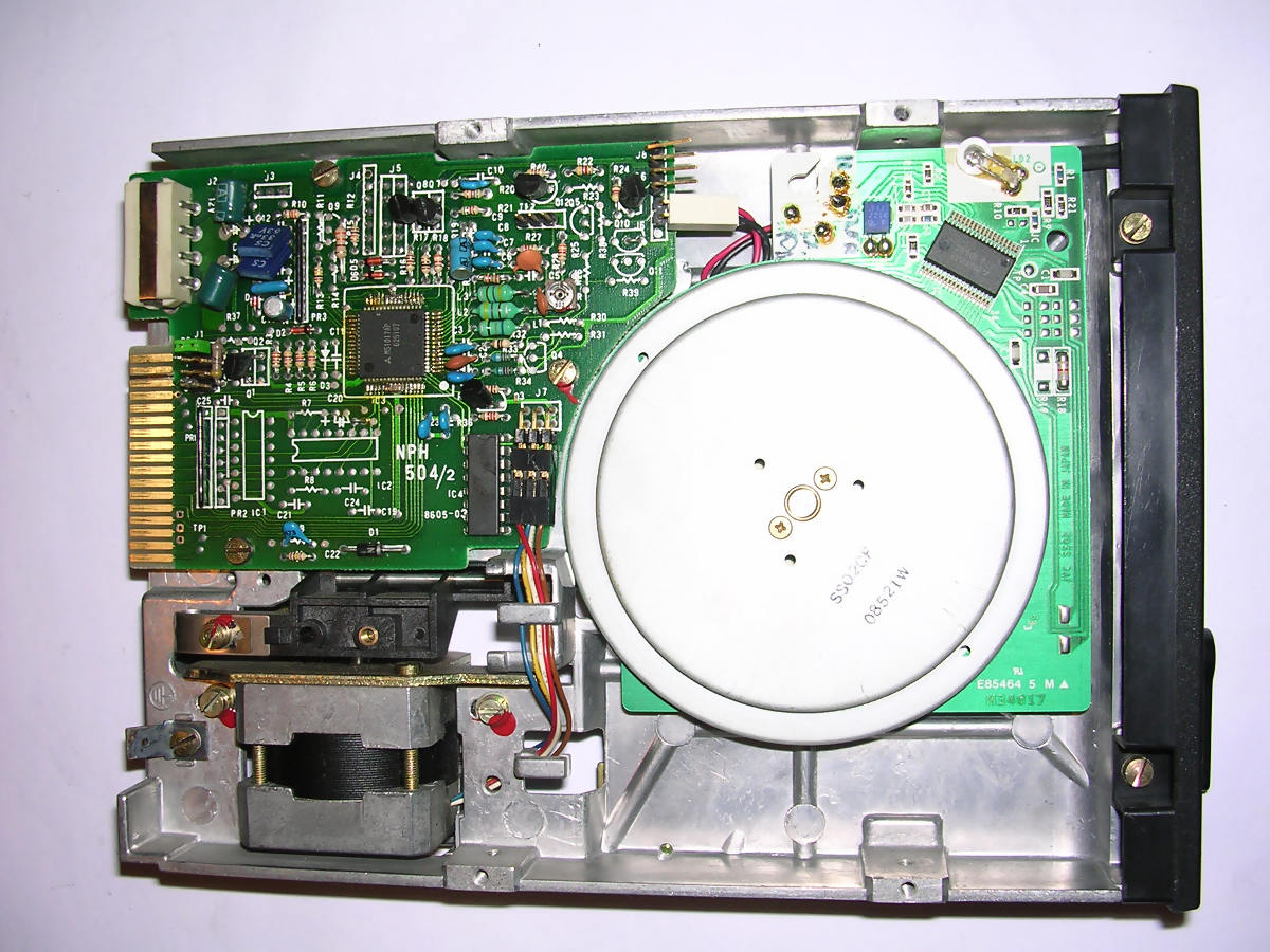 Here you'll see a few examples of 5.25" disks, drives and accessories. You can also look in PCs or 8-bit Micros, as they may have their own floppy disk drives. In these examples you can see what mechanisms are used in floppy drives to move head or disc itself.