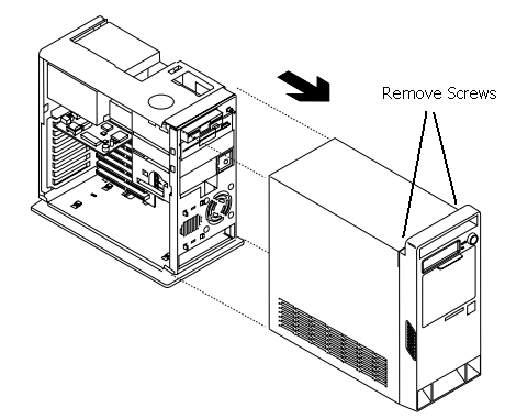 2. Slide the computer off the casing, by pulling front part towards you while leaving computer in the back. Front side and metal cover will slide. To help, you can try to put computer on its rear or gently push the floppy disk drive.