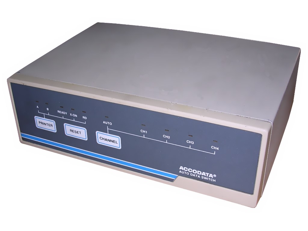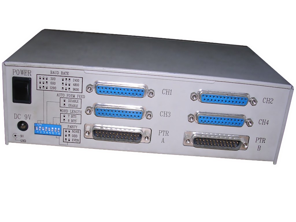 This device was used to switch 4 terminals to 2 printers. Any terminal may be connected to any printer. It has some buffering capabilities and automatic terminal selection.
