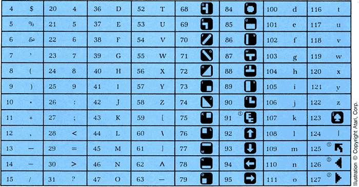 Before we leave the wonderful world of character graphics, we need to bring up a few more things. First of all, if you've looked at the ATASCII table yet, you've probably noticed that there are only 128 characters in the character set. But each byte in screen memory can hold a number between 0 and 255, or a total of 256 numbers. What about the other 128 characters? Well, if GTIA sees a character value greater than 127 (in other words, if bit seven is set) then it takes the value, subtracts 128 from it to get a new value, and then puts the character with this new value up on the screen in inverse video. Inverse video is what you get when you type a character after pressing the inverse key (the key with either the Atari logo or a half-full square on it, depending on which Atari computer you have). So, for example, an inverse video "H" would have a value of 168 (40 + 128).