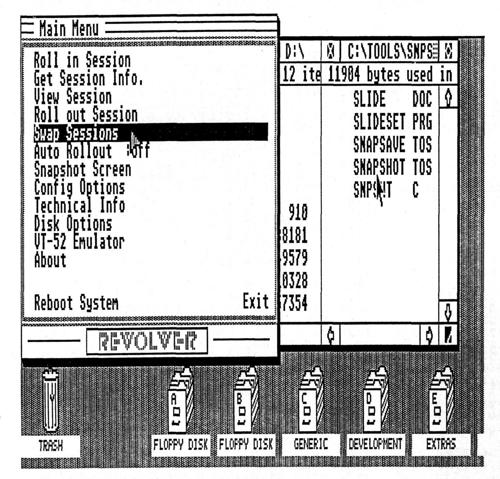 Revolver (Intersect, $49.95 list) is another program that, among other things, switches between various applications. Revolver can save a copy of the entire one megabyte of memory in your 1040 ST to a compressed disk file. At a later time, you can reload the disk-file data into your ST's memory and begin running the program where you left off.