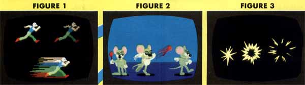 A few months back, I loaded one of the scenes from the Art & Film Director video into my ST and decided to try a little experiment on it. At the end of the shot, Megabit Mouse spun around and hurled a mallet at and through the Art Director toolbox. I had never been satisfied with this action, because I was unable to make him throw it as fast as I wanted and have it look right. To get a pleasing action, I had to use more frames than I wanted, and the throw lacked the force I sought. As an experiment, I deleted a few frames of Megabit spinning around with the hammer and replaced them with a single frame featuring a wildly distorted mouse. Figure 2 shows the start and end positions, with the distorted image in the middle. Like the Daffy Duck scene described above, when I played it back I couldn't really see the distorted image, but wow! did that throw have force! That single frame of distortion accomplished what I thought was impossible.