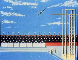 In the freestyle relay you must swim four laps, changing swimmers at the end of each lap. The 100-meter freestyle is identical, except with a single swimmer and only one lap. In these events you press the fire button in time with the swimmer's stroke for a minuscule boost of power. At each turn, change the swimmer's direction with the joystick at just the right moment for a fast turn. Pressing the fire button to the precisely timed metronome of the swimmer's stroke is tiresome and seems to make little difference. In fact, if you do nothing at all in the 100-meter freestyle, the swimmer will complete the race all by himself.