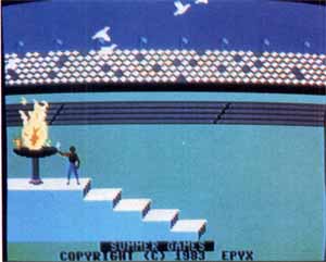 Summer Games from Epyx will take you back to the summer of 1984 to compete in eight different simulations of platform diving, pole vaulting, gymnastics, freestyle relay and 100-meter freestyle swimming, 4x400meter relay, 100-meter-dashrunning and skeet shooting. The graphics are fairly good, but all the characters are two-tone blocky animations. This is a valiant effort to simulate the grandeur and excitement of the Olympic Games, but some events are little more than animations with you as a spectator.