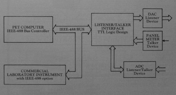 In December 1974 the IEEE Standards Board approved what is now known as IEEE Standard 4889 10that describes a general purpose instrument bus (GPIB) for programmable instruments. The GPIB is an improved version of HP-IB (Hewlett-Packard Instrument Bus) used with a family of instruments from Hewlett-Packard Co. GPIB uses a party-line bus structure to which a maximum of 15 devices may be connected. Sixteen signal lines (Figure 2) provide communication of 8-bit commands and data bytes between a bus controller (such as PET) and "listener" and/or "talker" devices connected to the bus via a standard cable.