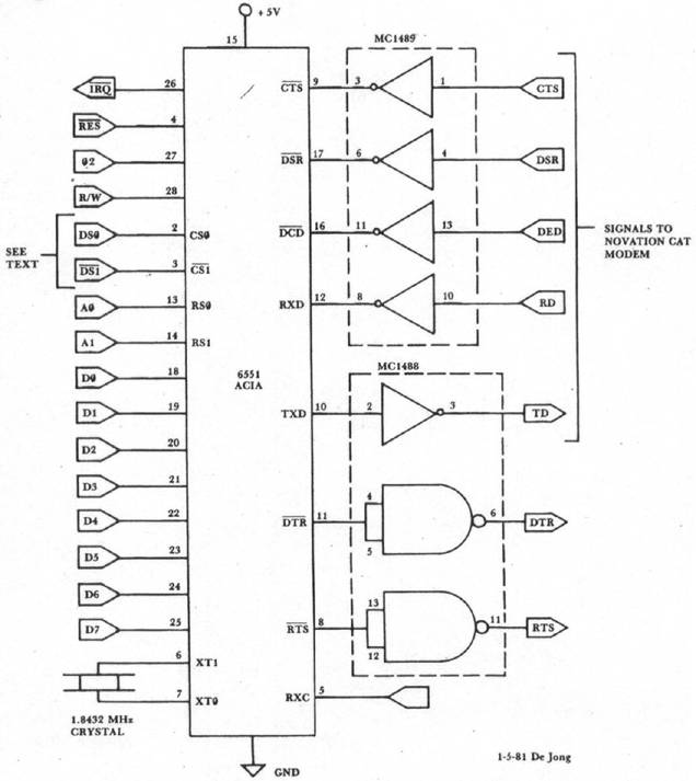 The connections to the left of the 6551 ACIA are made to the user's microcomputer system. Most of the signals are standard 6502 system bus signals, and require no explanation. Thus, address lines Aθ and A1 are used to address the four registers of the 6551, and are connected to the register-select pins RSθ and RS1. (You will probably want to obtain a specification sheet from either Rockwell or Synertek when you get your 6551; in fact, I advise you not to build the circuit without a spec sheet.) The data bus connections are shown in Figure 1, as well as several of the 6502 control lines (R/W, θ2,