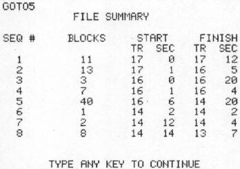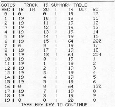 A summary table such as this is made for each track scanned. The zeros in the IN column indicate the initial block of a file. The 64 in the OUT column shows where a file ends.