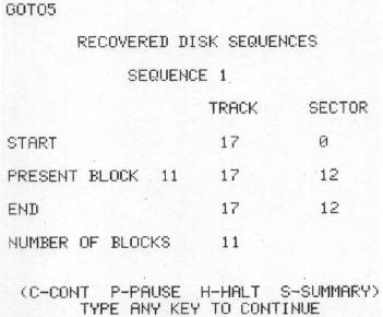 This table summarizes the completed scan results. The START track and sector numbers are needed to use the LOOK and RETRIEVE options.