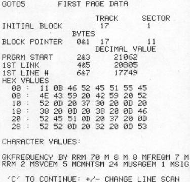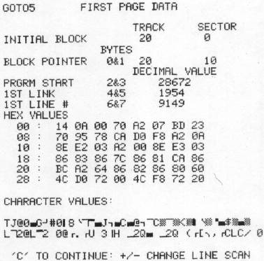 The next major problem is the identifying which file is which (since only the disk knows where a file was saved and on which half of the disk). The program offers you a number of appropriate options at this point, and the most useful one for file identification is labeled LOOK. LOOK pulls the initial block of any file out and extracts information that will probably allow you to identify the file. First, it displays in a useful form the first four pairs of bytes. The first pair are the pointers to the next block. If the file is a program the next pair of bytes tell where the program is to be loaded in memory. For Basic programs, this is usually 1024. The third and fourth pairs of bytes are from the program itself. They are the link and line number of the first instruction in the basic program. If the file is a machine language program or a sequential file, then you get weird and meaningless values for the link and line numbers. Next, LOOK gives you the first 48 bytes of the program in hexadecimal form (as if they were being examined by the machine language monitor). Finally, LOOK gives you a printed "translation" of the first 240 bytes. Basic commands are tokenized and appear as reversed characters or symbols. The link and line pointers also can look quite strange. However, numbers, variables, anything between quotes, and REM statements all appear as usual. Thus, if you have some convenient identifications at the beginning of your program, you will be able to recognize them. To see how this "translation" takes place, see lines 1360-1390 and 5090-5095. Eighty characters are scanned at one time and you can go from one set of eighty to another. With this amount of information it is usually quite easy to determine what any file is and if you wish to recover it.
