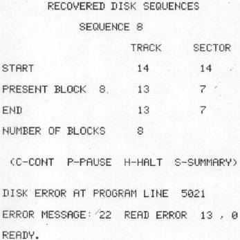 A couple of final comments: If you search tracks in which there are no programs, you may get a disk read error (22 READ ERROR 13,0). If this occurs, simply type GOTO 1000 and you will be able to go on without any problems. I hope this program is as useful to you as it has been to me. I made it because I really needed it. You may not need it often, but when you do, the situation is likely to be desperate!