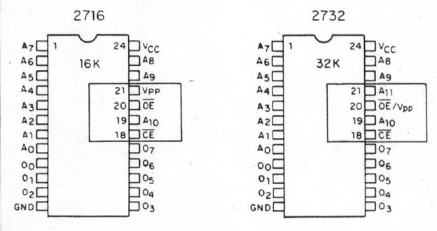 There are three EPROMs, the Intel 2716 (2K, Figure 2), the TI 2516 (2K, Figure 2), and the TI 2532 (4K, Figure 3), which can be plugged into the PET sockets with no problems. The 2K EPROMs are enabled for the lower 2K of the 4K socket address because Address Bit 11 acts as a chip select. However, these EPROMs can't be used with the Spacemaker because it uses Socket Pin 21, a high-enable chip select on 2K and 4K ROMs, to select one of its two sockets.