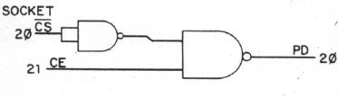 The TI 2532 eprom can be used with the Spacemaker by connecting Socket Pin 20 through an inverter to a NAND gate, connecting Socket Pin 21 to the same NAND gate, and finally, the output of the NAND gate to Socket Pin 20 of the TI 2352. Also Socket Pin 21 (Vpp) of the TI 2532 must be connected to a 5-volt supply (Socket Pin 24). See Figure 6 for a schematic diagram.