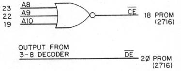 The address space $E900 to $EFFF is not used and is available for expansion. It can be used with a modification of the method for 2K EPROMs and a 2716 EPROM. The method is the same as that described above, except that the 2716 EPROM is not enabled for the first 256-bytes of its address space. This can be done with the 3-to-8 decoder enabling one of the chip selects and Address Lines 8, 9, and 10 through a three-input NOR gate. This enables the other chip select. Using the NOR gate will disable the EPROM for the first 256 bytes of the 2K range (Figure 8).