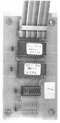 The 2716 and 2516 2K EPROMs can't be used directly with the Spacemaker, so a small board has to be built that includes enough decoding to allow one 2K EPROM for the lower 2K of the 4K available from the socket, and another 2K EPROM for the upper 2K address space. A three-to-eight decoder is used by Decoding Pin 21 (the high chip select from the Spacemaker), Pin 20 (the low chip select from the PET), and Pin 18 (Address Bit 11). Pins 18 and 20 of the EPROMs are connected together (as both are chip selects) and are connected to the decoder output as given in Table 1. Figure 7 shows a PC board with (from left to right) the ribbon cable input, the BASIC Programmer's Toolkit, a 2716 ROM, and the 3-to-8 decoder.