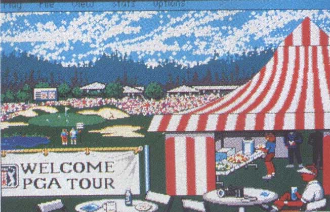 Put your skills to the test on any of three Tournament Players Club golf courses: Avenel, Sawgrass, or the PGA West Stadium. But before you go out on the tour, you'll want to visit the Pro Shop. This opening screen provides menus for Play, File, View, Stats, and Options and is a good example of the detail built into the PGA Tour Golf interface. You can pull down menus and play the game with keyboard commands, a mouse, or a joystick. From the Pro Shop Play menu, for example, you can hone your driving and putting skills, play a Practice Round, or move to a Tournament.