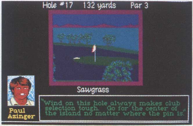 The graphic presentation is enhanced with fly-by views of each hole, accompanied by a tip from a top PGA golfer. Beginning at the pin, the camera rolls back down the fairway toward the tee, illuminating the approach to the green and the hazards that threaten your success. On a fast machine, say a 12-MHz 286 or a 86SX. these views are a lot of fun to watch (at least at the beginning). But I turned them off when playing the game on a Tandy 1000 because it took so long to run the graphics sequence. To its credit, PGA Tour Golf allows you to make such adjustments, enhancing your enjoyment of the game no matter what kind of computer you own.