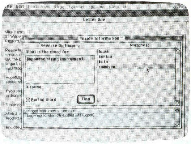 Inside Information's most innovative feature is its Reverse Dictionary. This option makes it possible to find matches for words, partial words, or phrases. The desk accessory conducts a search and presents a list of possible matches. For example, if you type in left side of ship, you'll get back the match, port. You can scroll through the list (which unfortunately isn't alphabetized) and double-click on an entry to call up a definition. You can also switch to any other view to see how the word fits in a hierarchical classification.