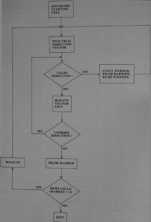 A dead-end, incidentally, could occur in as few as five steps. When it does occur, we can make use of the markers which were dropped along the way "Hansel and Gretel" style. These can be checked to determine which direction we came from, so that we can back up and look for untrodden paths. So long as none can be found, the program will back up, one step at a time, erasing the markers as it goes. When a new direction can be taken, the pointer is set off in that direction, and the process continues as before.