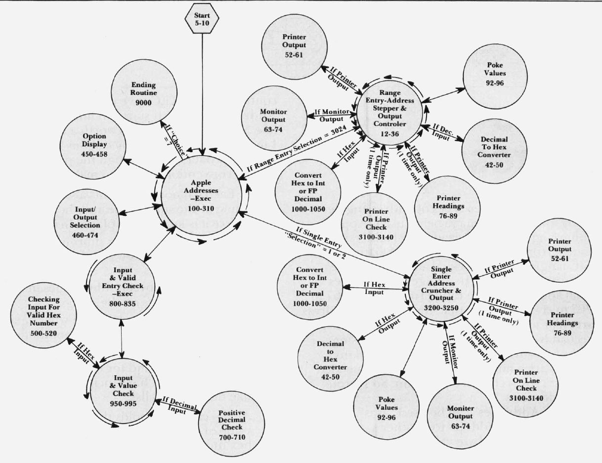 "Apple Addresses" makes extensive use of subroutines. This helps in organizing the program as well as making it shorter and easier to debug. The controlling or EXECutive routine is called Apple Addresses—Exec. It starts on line 100 and goes to line 310. Since a picture is worth a thousand words, I made what I call a balloon diagram (Figure 1) to show how data flows through the program. These are the conventions I used to make the diagram;
