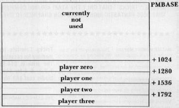 Player zero occupies PMBASE + 1024 through PMBASE + 1279; player one is situated in locations PMBASE + 1280 through PMBASE + 1535, and so on for players two and three. Line 1040 clears any residual data — if you're in a hurry and are sure that this area is already clear (i.e., following a cold start), you won't need line 1040.