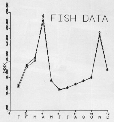 Do moving averages always smooth out data? Not if there is a real monthly variation. Take, for example, Figure 2, which is a plot of the quantity of fish taken (in millions of pounds) from Lake Michigan in the years 1952-1957. One curve is the simple average, and the other curve is the moving average. Notice here that the two curves are almost identical, so much so that I didn't try to identify them. Here, there really is a seasonal variation, and it shows up even when the long term trend is removed. It's obvious that you should go fishing in April and November, and avoid June, July, and August, when most people, of course, go fishing (data from Michigan Department of Conservation).