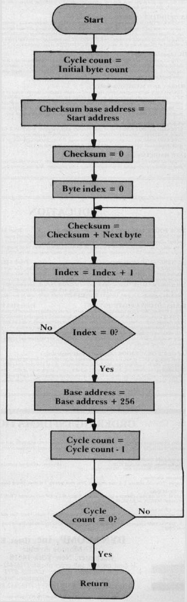 A flowchart for the main program loop is shown in Figure 1. As you can see, this flowchart is nothing more than a detailed version of the algorithm we defined in preceding Steps 1 through 6. The program begins by calculating the byte count, then calls the checksum subroutine (CHKSUM) to generate the initial value of the checksum. This done, the base address and byte index are initialized to reference the first byte in test memory.