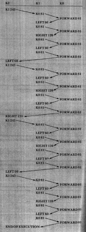 When we used K2, it used K1 four times, and K1 used K0 16 times to actually draw the lines. A table for K3 would be four times longer than this and would require four columns. If you decide to construct such a table yourself, you will see that by the time K3 has finished, it will have used K2 four times, K1 16 times, and KO 64 times.