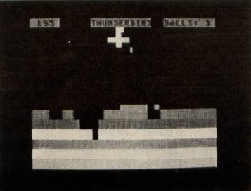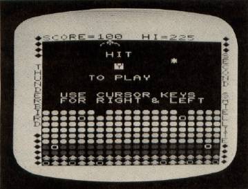 You score these points by keeping the satellite in the playing field. The satellite can break out the top and the bottom of the screen. When it breaks out the bottom, you score 1000 points, and a new and more difficult playing field is set up for you. If the satellite breaks out the top of the field, your game is half over. You can lose only two satellites out the top. You prevent the satellite from breaking out the top by deflecting it back into the field with the Thunderbird. The Thunderbird is moved across the top ofjhe field with the cursor control keys.
