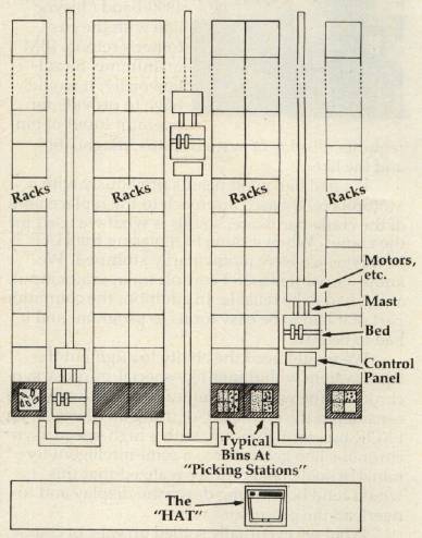 Each of the three cranes communicated, over a 300-baud asynchronous link, with a single master controller, which sent out commands to the cranes to retrieve various packages, replace others, and so forth. The packages being stored and retrieved contained bins of loose parts. The idea was to fill orders for these loose parts by bringing their respective bins to the front of the aisles, where human "parts pickers" would extract the appropriate parts and then send the bins back into the racks until the next time they were needed.