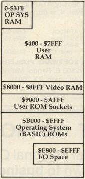 Now, there is actually a little gap, running from $E800 to $EFFF, which the 8032 decodes as I/O space rather than ROM. It is in this range that Commodore has placed its PIAs ("Peripheral Interface Adapters", i.e., parallel I/O ports) and VIAs ("Versatile Interface Adapters", another flavor of same) for communicating with the outside world via keyboard, tapes, the IEEE bus, etc.