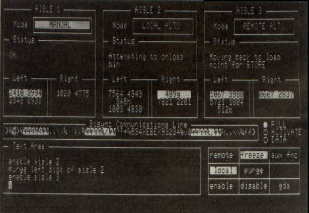 No static photograph can really give you an adequate idea of what the HAT screen looks like when the system is in operation. The bytes in the bisync window are constantly whizzing around, while the status fields for each of the aisles are continually changing as the cranes go through their paces. Meanwhile, the bin queues are constantly filling up and emptying out, allowing you to watch as each bin request gradually moves up in sequence until it becomes current.